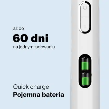 Wbudowana najwyższej klasy bateria pozwala na codzienne mycie zębów bez konieczności ładowania aż do 60 dni!