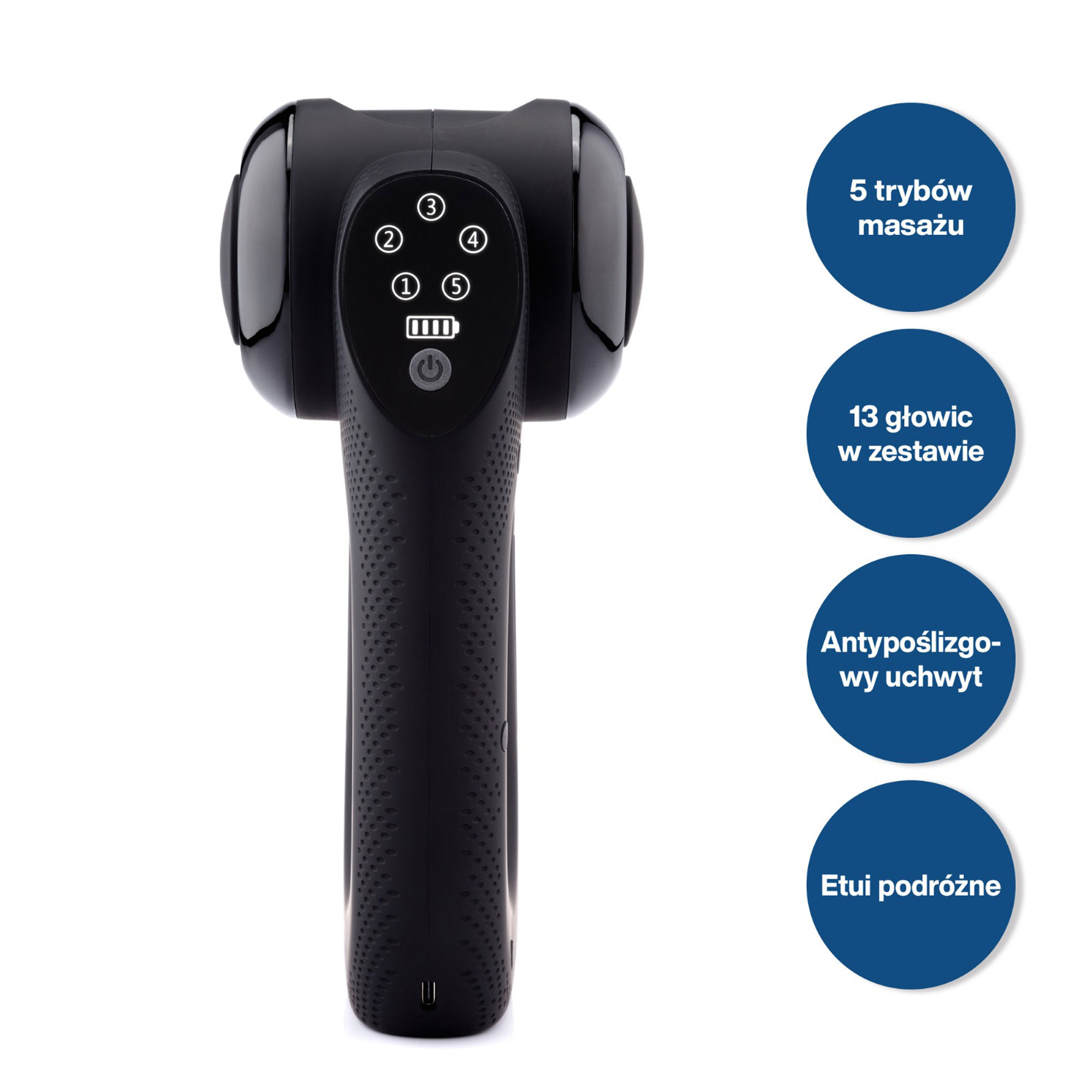 W zestawie wraz z etui podróżnym odpornym na uszkodzenia znajduje się aż 13 głowic masujących w tym głowica chłodząca oraz elektryczna – rozgrzewająca.