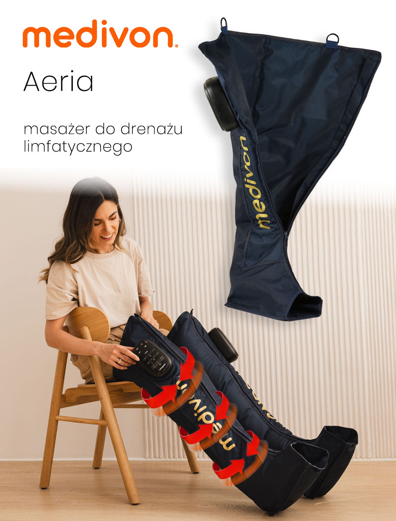 Urządzenie MEDIVON Aeria o wymiarach 35 x 120 cm i mocy 25 W wykorzystuje technologię naprzemiennego ucisku, co stymuluje krążenie limfy i poprawia odporność.