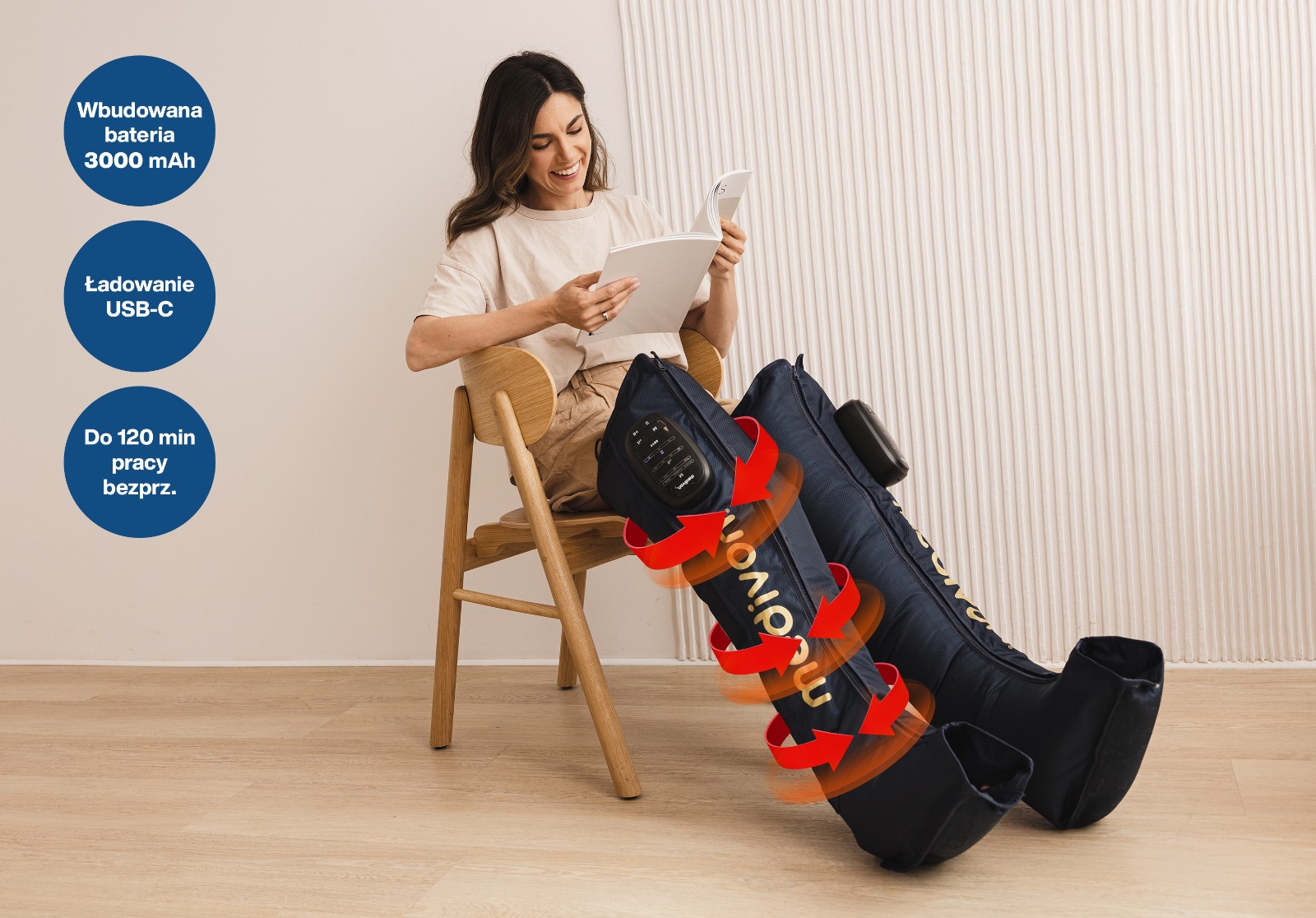 Ponadto 5 niezależnych stref uciskowych na każdej nogawce precyzyjnie masuje różne partie mięśni, co zapewnia skuteczną rehabilitację oraz komfort użytkowania.