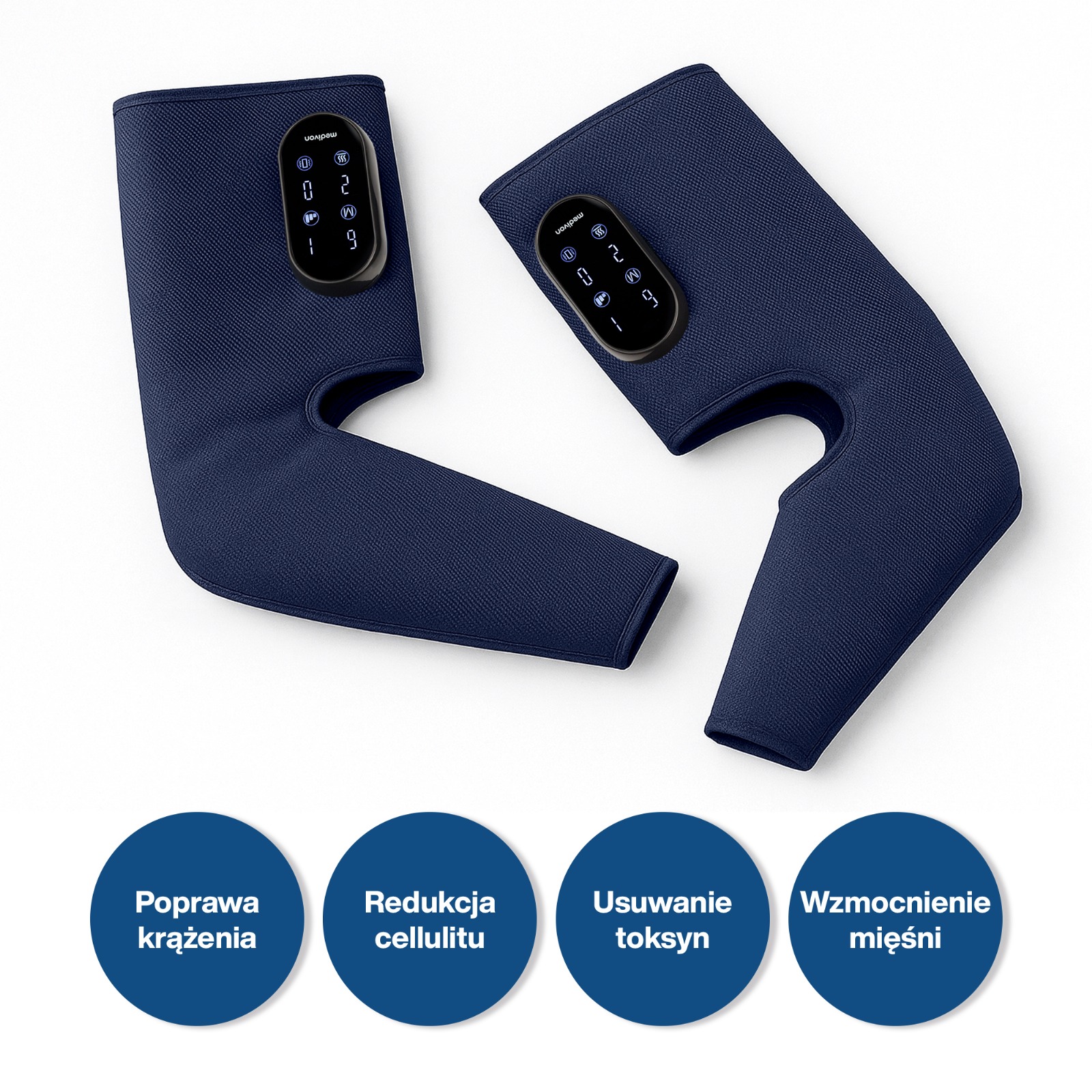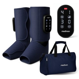 Medivon Misto wyróżnia się na tle innych masażerów dzięki swojemu eleganckiemu, granatowemu wykończeniu i ergonomicznemu designowi. Zintegrowany ekran LED, umieszczony na bocznej stronie, pozwala na intuicyjną obsługę, a regulowane opaski gwarantują, że masażer będzie pasował i dostarczy komfortu użytkownikom o różnych rozmiarach nóg. Wbudowana pamięć użytkownika pozwala na zapisanie preferencji, co sprawia, że każda sesja masażu jest w pełni personalizowana.