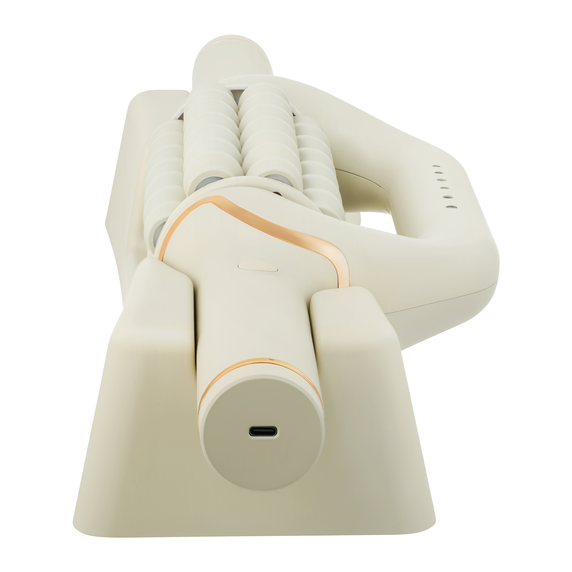 W zestawie znajduje się stabilna baza, która umożliwia korzystanie z urządzenia bez potrzeby trzymania go w dłoniach. Dzięki temu można wykonywać masaż stóp lub łydek w pozycji siedzącej, co sprawdza się podczas pracy przy biurku lub relaksu w domu. Bezprzewodowa konstrukcja i bateria 4000 mAh zapewniają nawet do 120 minut działania po jednym ładowaniu, co pozwala na swobodę korzystania w dowolnym miejscu.