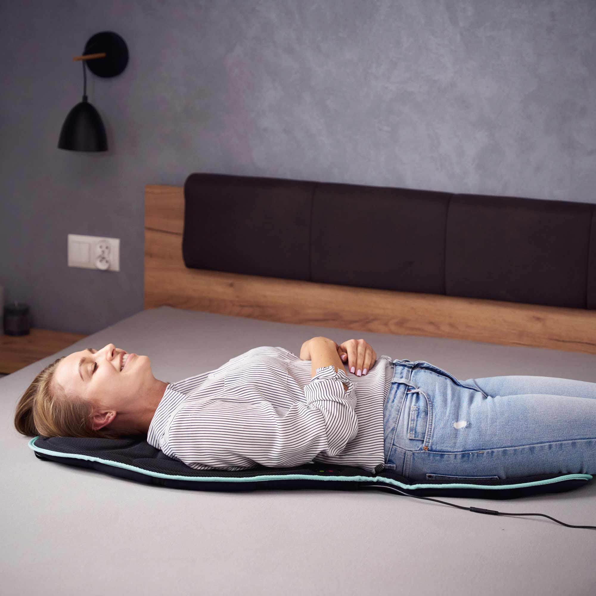 Zintegrowany system grzania pozwala rozluźnić napięte mięśnie i wspiera krążenie krwi, szczególnie w chłodniejsze dni. Ogrzewanie działa jedynie przy aktywnej funkcji wibracji, co zwiększa bezpieczeństwo użytkowania. Wbudowany timer automatycznie wyłącza urządzenie po określonym czasie, zapewniając spokojne i bezpieczne korzystanie z maty nawet podczas dłuższych sesji.