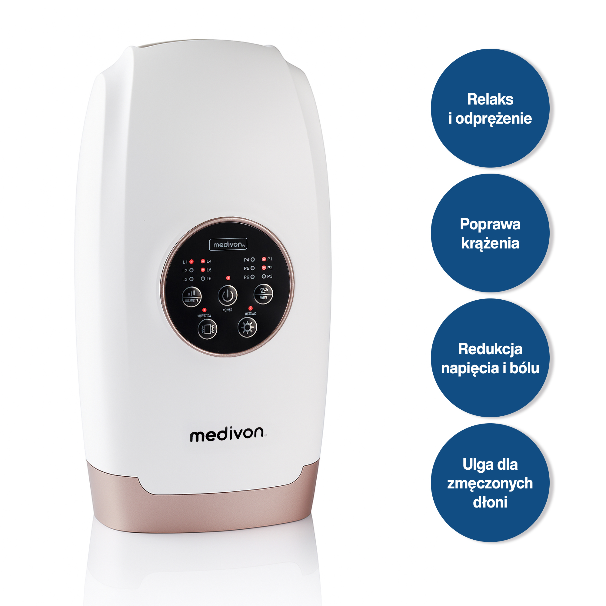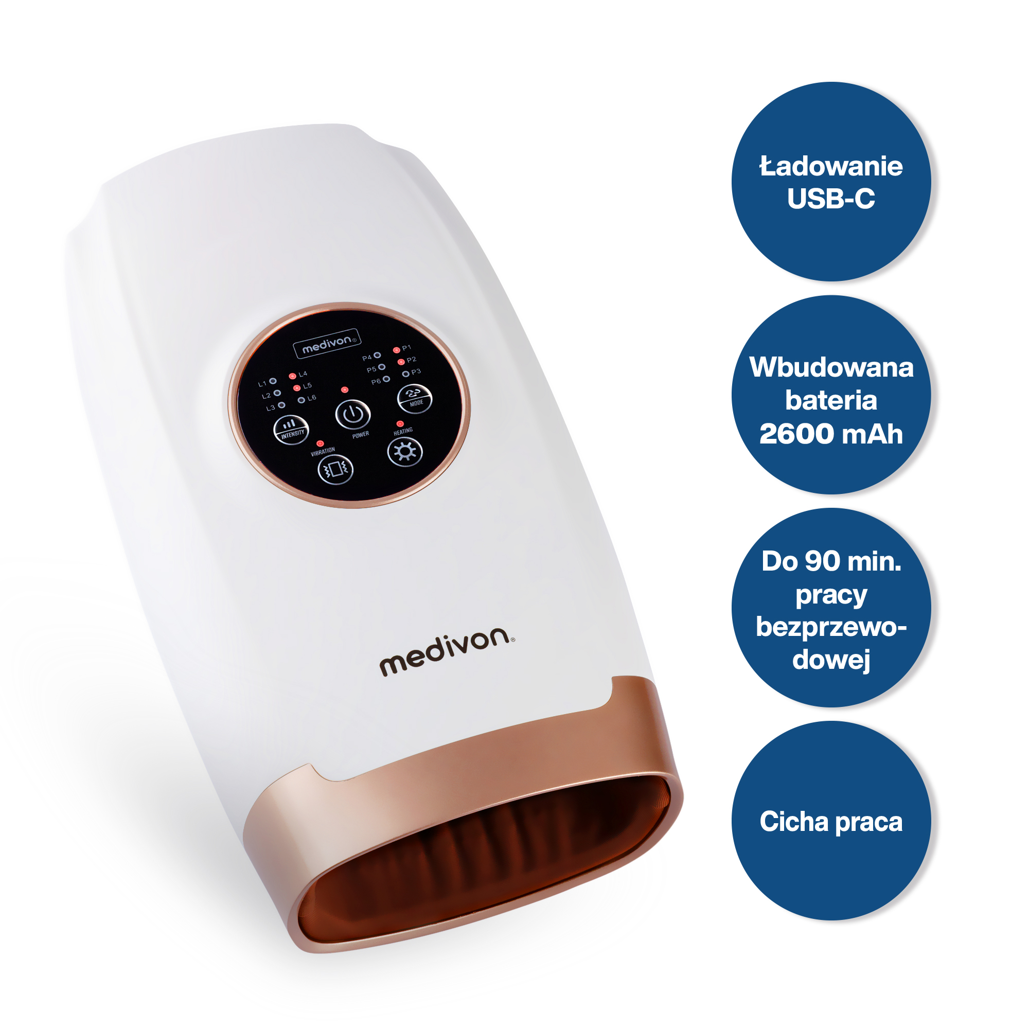 Medivon Hand umożliwia masaż wibracyjny. To idealna forma masażu rozluźniająca spięte mięśnie. Dzięki temu działa odprężająco na stałe przeciążenia tych samych grup mięśni.